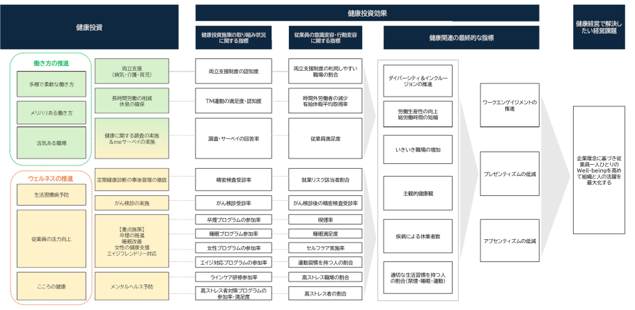 2.従業員一人ひとりが自らの能力を十分に発揮し、いきいきと働くことができる職場づくりを進める当社グループでは、健康経営方針に基づき、「働き方の推進」と「ウェルネスの推進」の両輪で健康経営を戦略的に取り組むことで従業員一人ひとりのWell-beingを高めて組織と人の活躍を最大化することに繋げていきます。