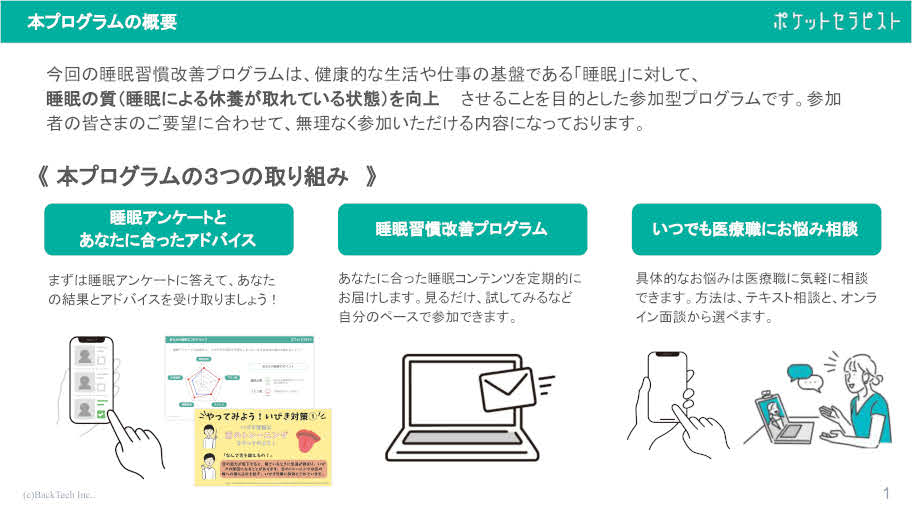 2025年1月にはキリンビバレッジ株式会社の睡眠オンラインセミナーを三菱ケミカルグループとして※開催。741人がライブ配信に参加し、アーカイブ視聴も含め多くの従業員が睡眠の重要性や良質な睡眠を確保するためのセルフケアについて学ぶ機会となりました。また、睡眠に課題を抱える対象者(希望者)に対し、株式会社バックテックの睡眠プログラムを導入。セミナー動画の受講や個別面談を実施し、3ヶ月かけて睡眠改善を図る内容で、74人が参加し睡眠改善に取り組んでいます。